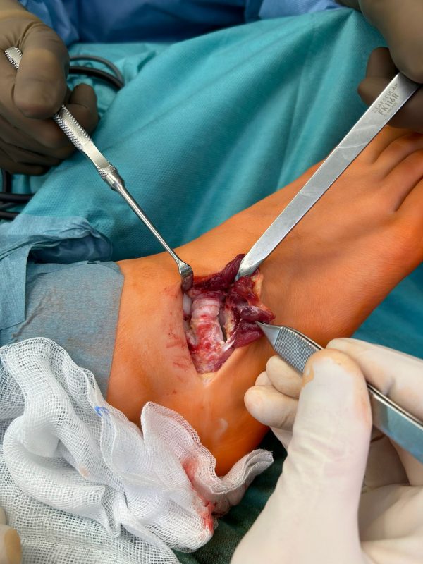 Auf dem Bild zu sehen die chirurgisch dargestellte Coalitio Calcaneo-naviculare unmittelbar vor der Resektion. Copyright: Dr. S. Böhr